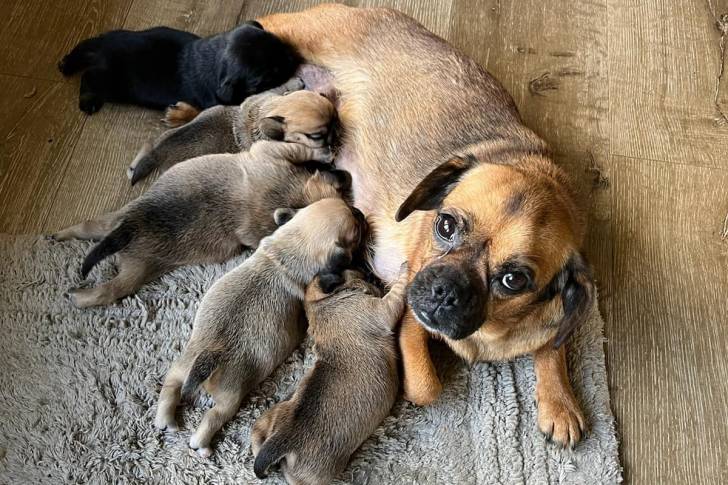 Un Pugalier femelle allongé sur un tapis gris avec ses chiots