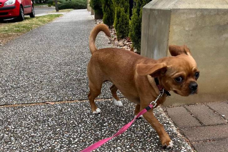 Un Pugalier tenu en laisse et marchant sur un trottoir