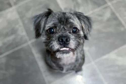 Un Pugapoo à poil gris assis sur un sol carrelé gris