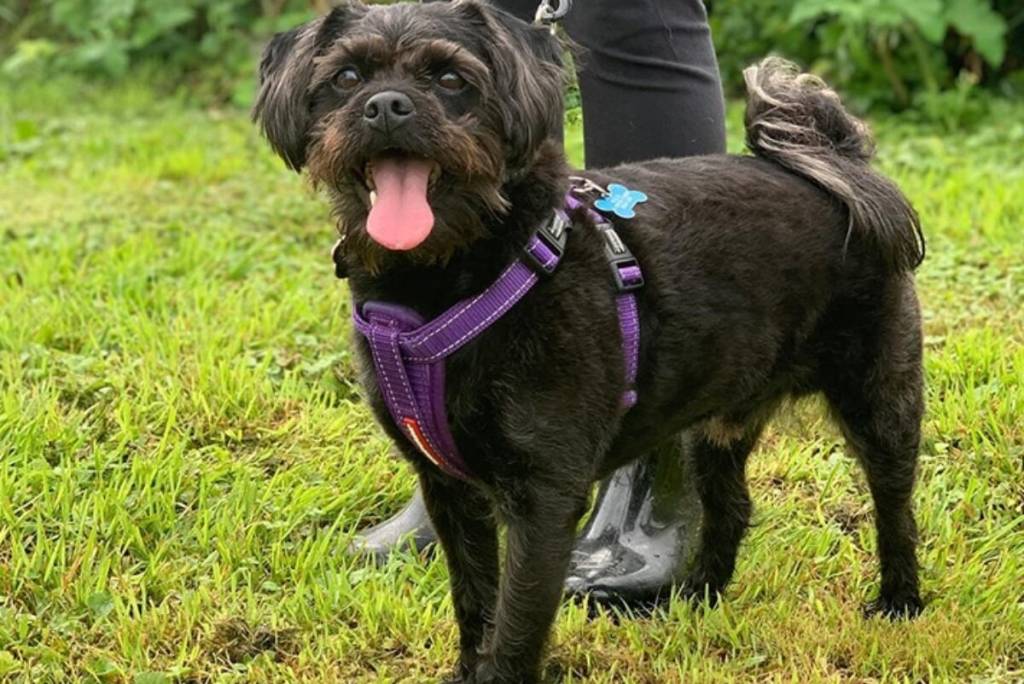 Un Pugapoo portant un harnais violet sur un terrain herbeux