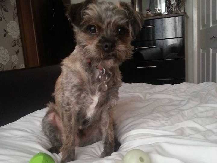 Un Pugapoo assis sur un lit avec deux jouets devant lui