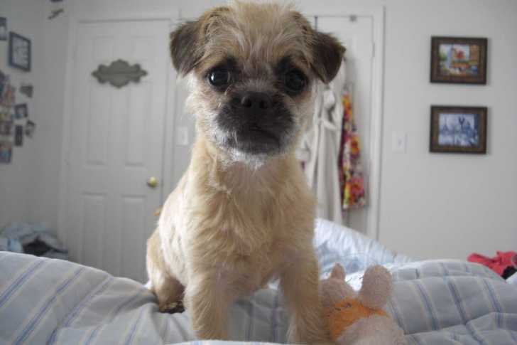 Un Pugapoo assis sur un lit dans une chambre