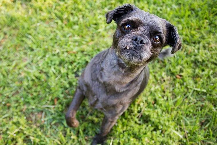 Un Pugapoo debout sur une pelouse verdoyante et regardant en direction de la caméra