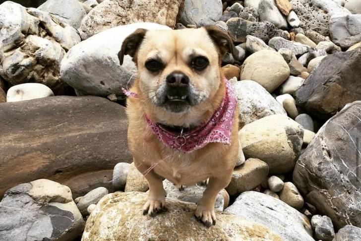 Un Puggle assis sur une pierre et portant un foulard autour du cou