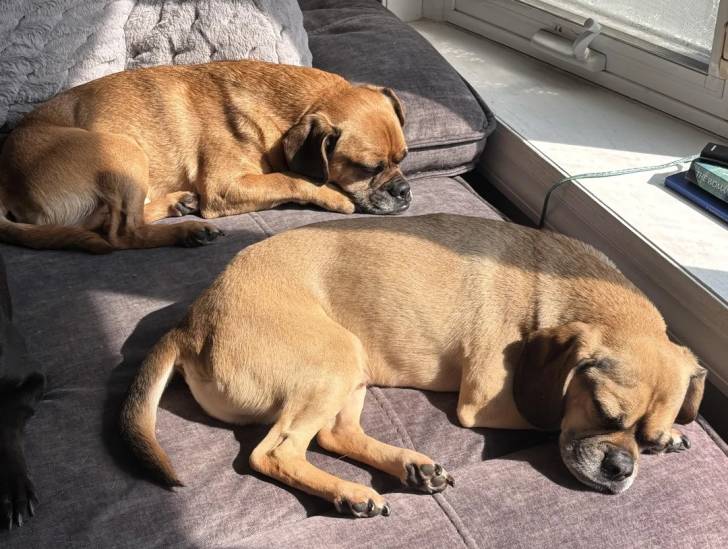 Deux Puggles allongés sur un canapé