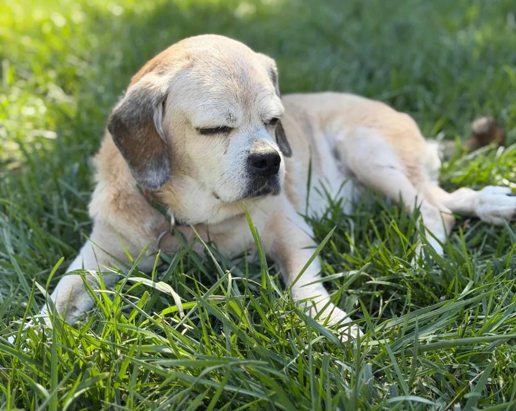 Un Puggle allongé sur un terrain herbeux et portant un collier autour du cou