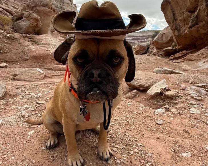 Un Puggle assis sur une surface sableuse et portant un chapeau