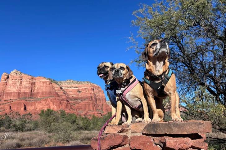Trois Puggles assis sur des pierres