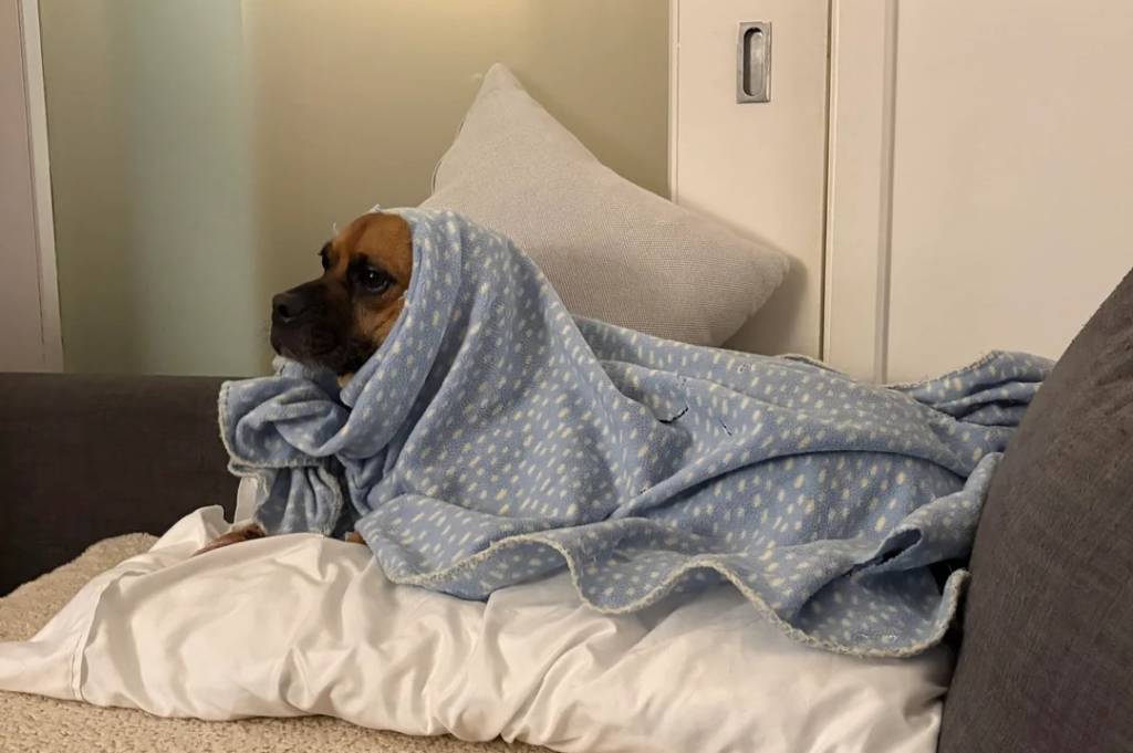 Un Puggle allongé et recouvert d'un drap