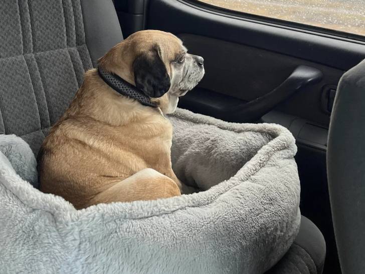 Un Puggle assis dans un panier à l'intérieur d'un véhicule
