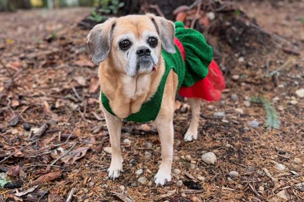 Un Puggle au pied d'un arbre et portant un habit pour chien