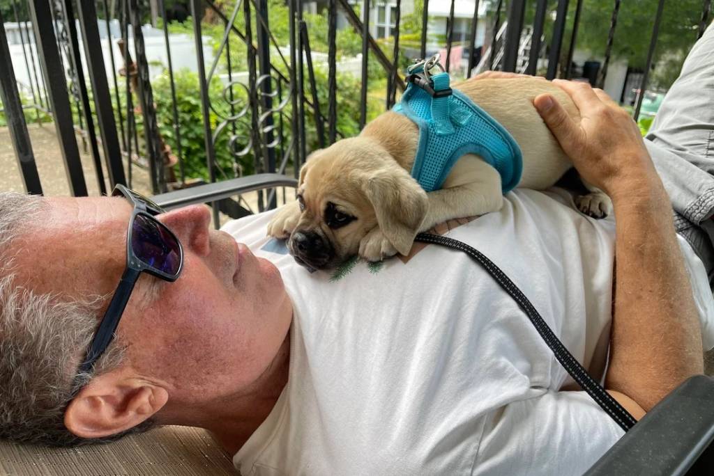 Un Puggle allongé sur le torse d'un monsieur