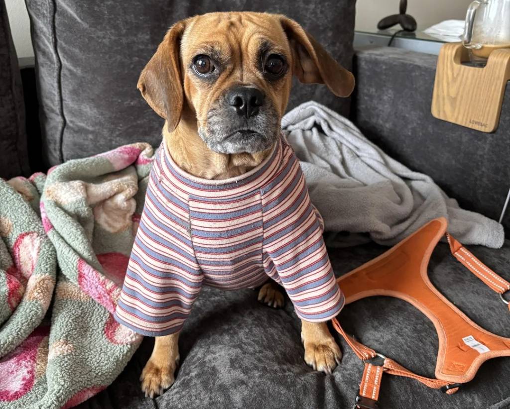 Un Puggle assis sur un canapé et portant un habit pour chien