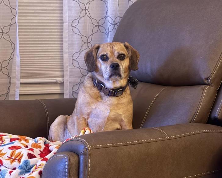 Un Puggle assis sur un fauteuil