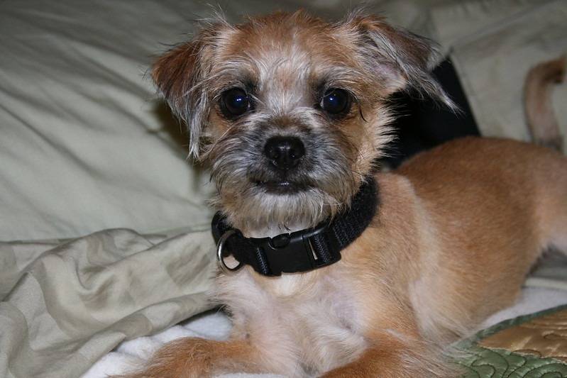 Un Pugshire portant un collier et allongé sur un lit