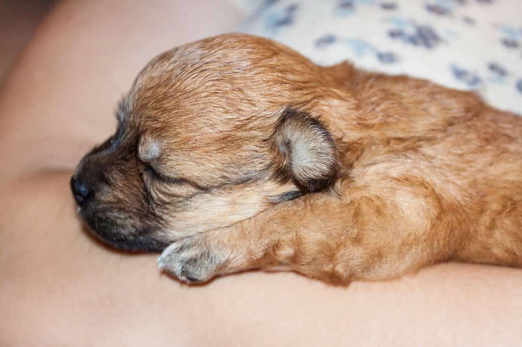 Un Pugshire allongé sur les genoux d’une personne