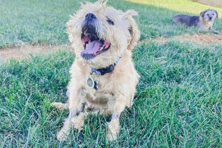 Un chiot Pugshire dort en faisant des petits bruits, puis se réveille