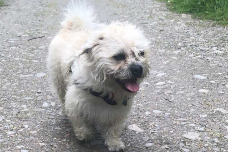 Photo d'un Pushon portant un harnais et marchant sur du gravier