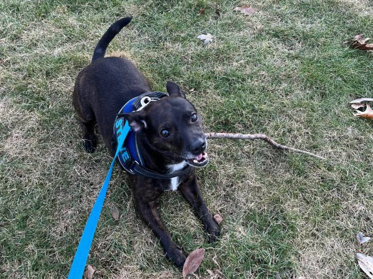 Un Rat-Cha allongé sur un terrain herbeux et qui est tenu en laisse