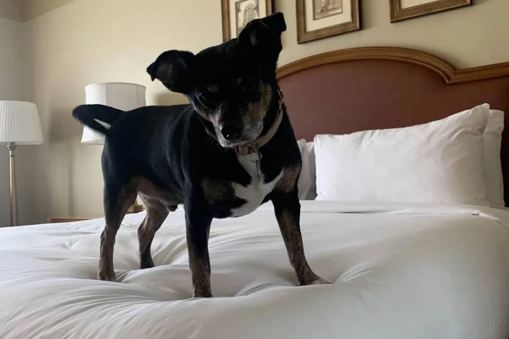 Un Rat-Cha sur un lit et portant un collier autour du cou