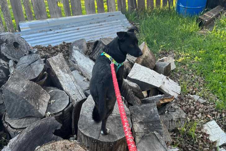 Un Rat-Cha sur une bûche et qui est tenu en laisse
