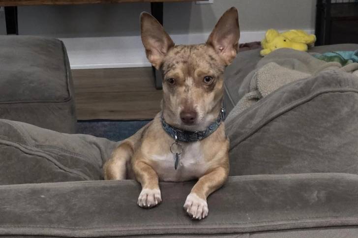 Un Rat Terrier dans un panier et portant un collier autour du cou