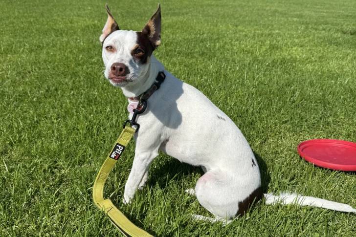 Un Rat Terrier assis sur une surface gazonnée et qui est tenu en laisse