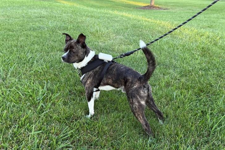 Un Rat Terrier sur un surface gazonnée et qui est tenu en laisse