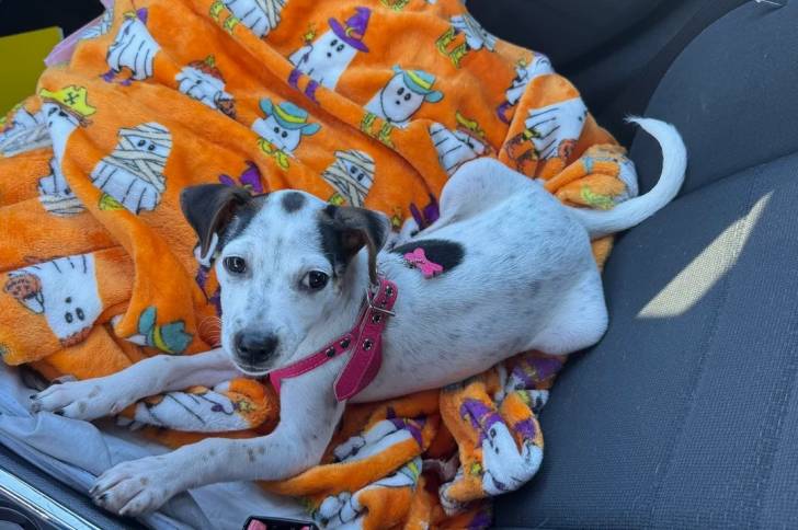 Un Rat Terrier allongé sur le siège d'une voiture et portant un collier autour du cou