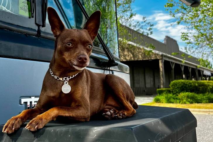 Un Rat Terrier allongé devant un bus et portant un collier autour du cou
