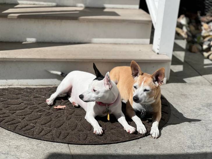 Deux Rat Terrier allongés sur un tapis et portent tous deux un collier autour du cou.