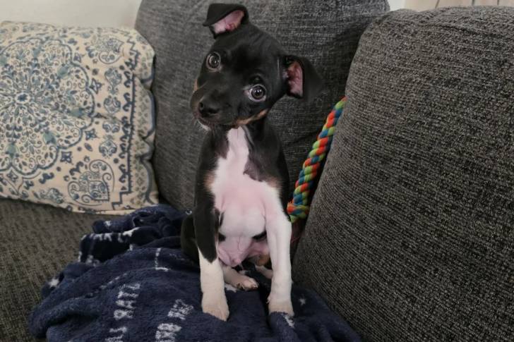 Un Rat Terrier sur un canapé et regardant vers la caméra