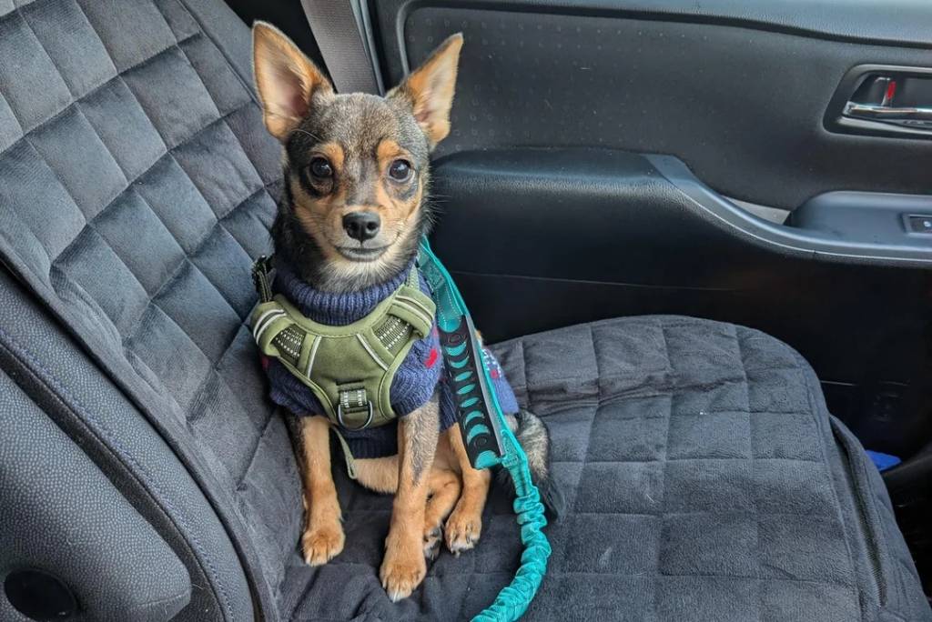 Un Rat Terrier assis sur la banquette arrière d'une voiture et qui est tenu en laisse