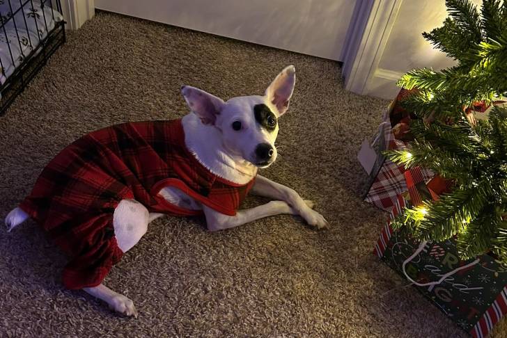 Un Rat Terrier allongé sur une moquette et portant un habit