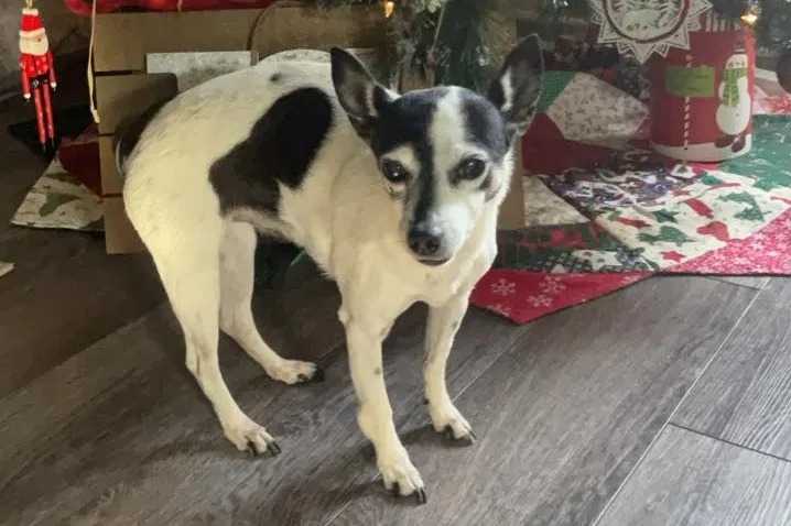 Un Rat Terrier sur un plancher et regardant vers la caméra