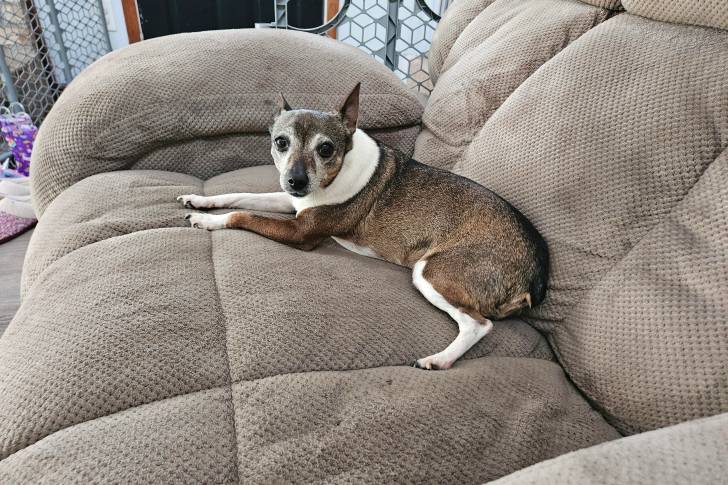 Un Ratshire Terrier allongé sur un canapé et regardant vers la caméra