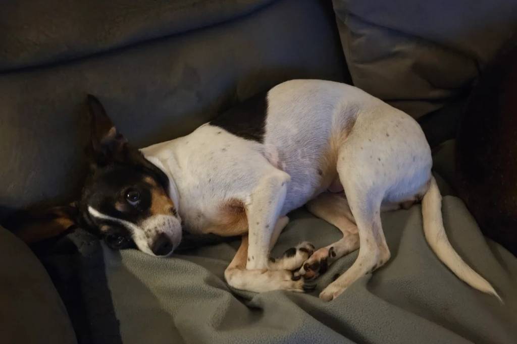 Un Ratshi Terrier allongé sur un canapé et regardant vers la caméra