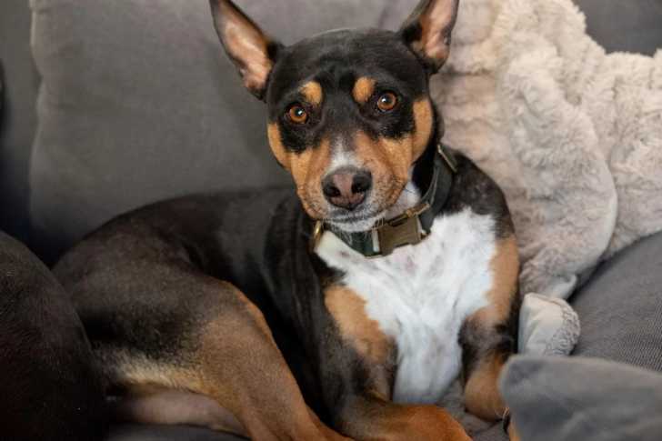 Un Ratshi Terrier assis sur un canapé et portant un collier autour du cou