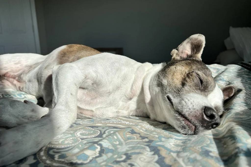 Un Ratshi Terrier allongé sur un lit et semblant dormir