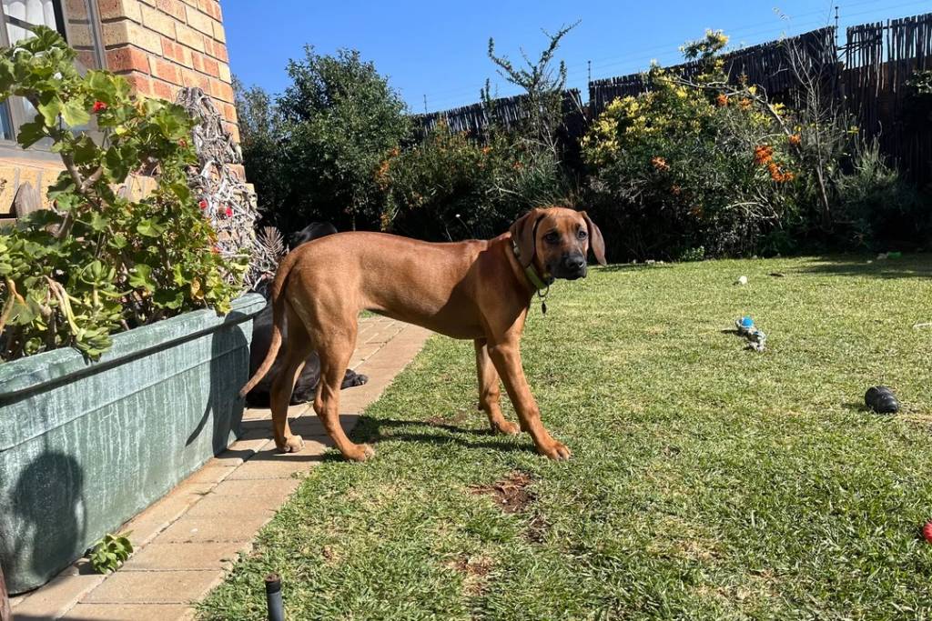 Un Rhodesian Labrador au pelage marron, se tenant à quatre pattes et portant un collier au cou