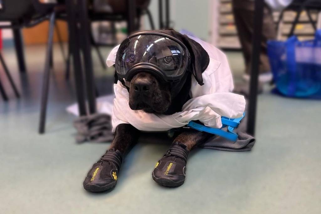 Ce Rotticorso s'amuse avec un jouet accroché à un arbre
