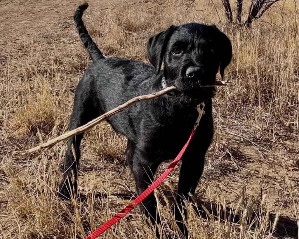 Un Rottle ayant un bâton dans sa gueule et qui est tenu en laisse