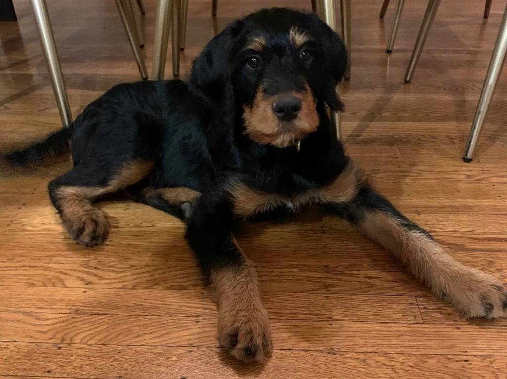 Un Rottle allongé sur un plancher et portant un collier autour du cou
