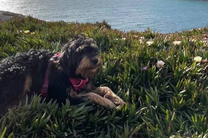 Un Rottle assis sur une surface herbacée et qui est tenu en laisse