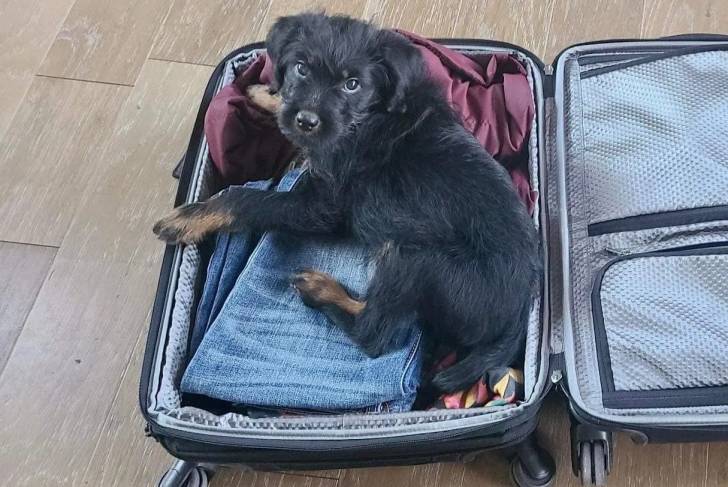 Un Rottle allongé dans une valisette et regardant vers la caméra