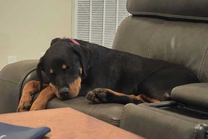 Un Rottpeake allongé sur un canapé et semblant dormir