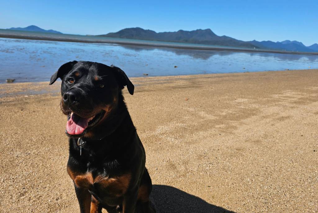 Un Rottpeake assis sur une surface sableuse et portant un collier autour du cou