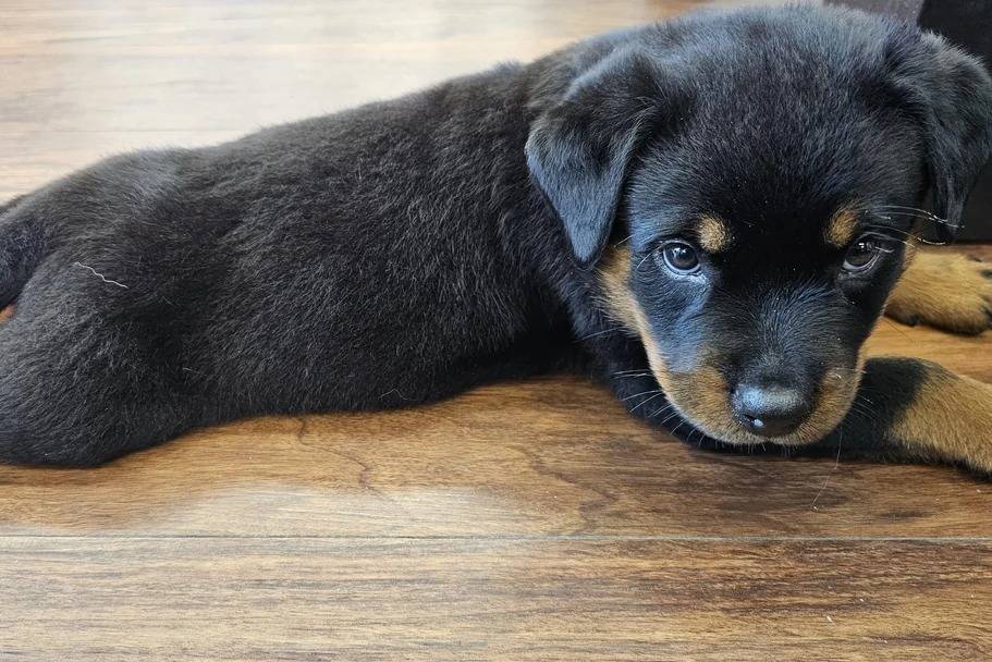 Un Rottpeake allongé sur un plancher et regardant vers la caméra