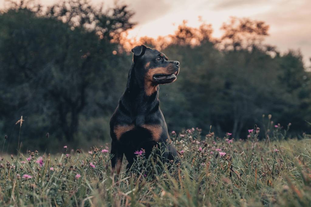 Un Rottpeake assis sur un terrain herbeux et semblant détendu