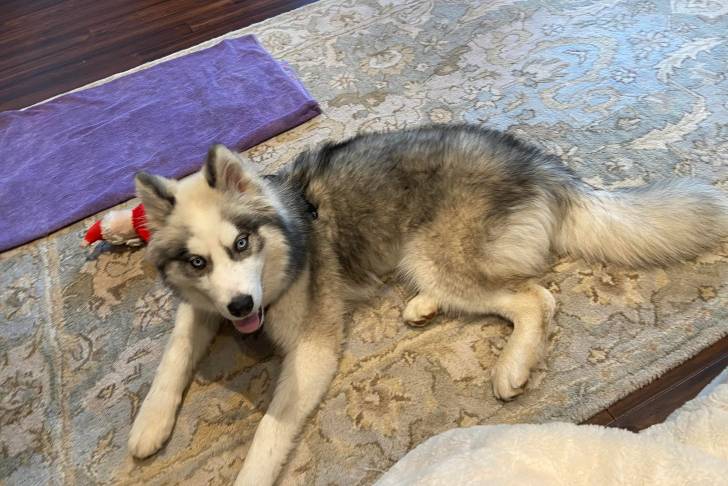 Un adorable chien Rottsky apprend à se coucher et à rouler.